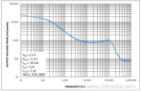 c)半導(dǎo)體結(jié)構(gòu)自身會產(chǎn)生固有的噪聲,主要是由自由原子與基礎(chǔ)材料晶體結(jié)構(gòu)碰撞而引起。由于固有噪聲是一種半導(dǎo)體中與電流傳導(dǎo)原理相關(guān)的物理現(xiàn)象,因此可以通過一些技術(shù)來抑制,但是不可能將其徹底去除?,F(xiàn)代LDO的輸出噪聲可以達(dá)到數(shù)以百計(jì)的微伏(uV)甚至更小,但是頂級LDO產(chǎn)生的噪聲就會達(dá)到微伏(uV)單位。