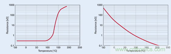 在超出某一特定溫度時(shí),正溫度系數(shù) (PTC) 熱敏電阻(左圖)的電阻出現(xiàn)急劇升高,故而適合用作溫度限值