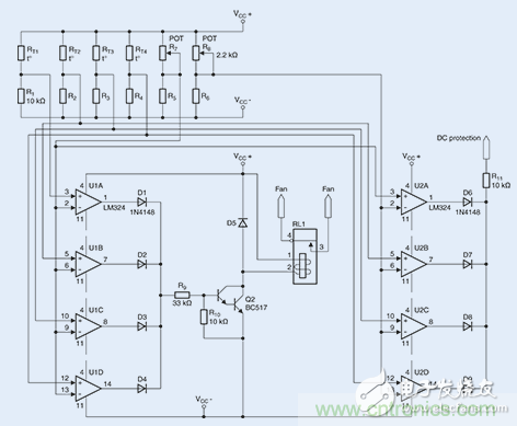 2個(gè)開關(guān)閾值的參考值將通過2個(gè)微調(diào)器,即R7和R8(分別為2.2 k?)進(jìn)行設(shè)置。如上所述,兩個(gè)微調(diào)器將分別產(chǎn)生900?或550?的電阻。至于8個(gè)所需的比較器(U1A-U1D以及U2A-U2D),則采用經(jīng)濟(jì)型LM324放大器。在滿負(fù)荷跳線模式下進(jìn)行的一個(gè)持續(xù)數(shù)小時(shí)的測試表明,風(fēng)扇能夠在85℃時(shí)可靠地進(jìn)行開啟。由于系統(tǒng)具有相對較低的熱量期限,故而無需采用常用的滯回比較器電路。