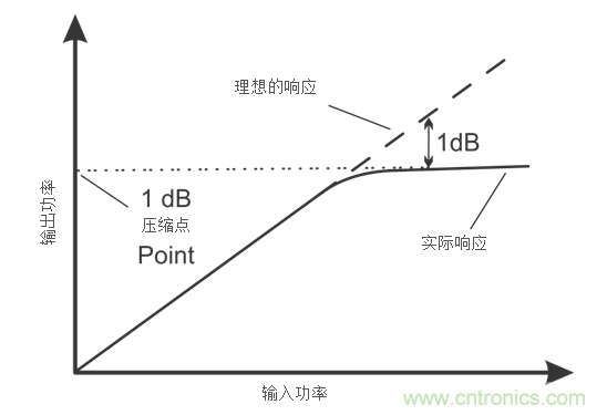 第二種規(guī)格,輸出1dB壓縮點(diǎn),實(shí)際上非常類(lèi)似于最大線(xiàn)性輸出電壓和電流的概念。它也被稱(chēng)為P1dB,在該點(diǎn)上,放大器從理想狀態(tài)下增益壓縮到1分貝的輸出功率級(jí)。圖1介紹了該概念,其中,實(shí)線(xiàn)表示測(cè)得的信號(hào),虛線(xiàn)表示理想的信號(hào)。有時(shí),一些測(cè)量將P1dB點(diǎn)與輸入而非輸出對(duì)照,這應(yīng)在計(jì)算中予以考慮。