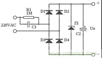 在實(shí)際應(yīng)用中,可以用下圖代替上圖,這里用了Z1正向特性和反向特性,其反向特性(也就是其穩(wěn)壓特性)來穩(wěn)定電壓,其正向特性用來在市電負(fù)半周給C1提供放電回路。