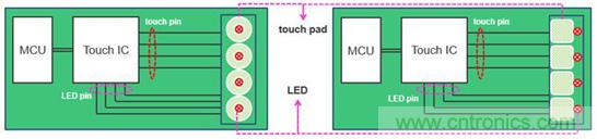 從LED驅(qū)動的角度,比較二者的異同。通常,觸控 IC內(nèi)置了LED Driver。如果應(yīng)用方案中需要使用LED表示觸控動作的有/無,并且應(yīng)用產(chǎn)品的結(jié)構(gòu)設(shè)計,要求LED緊鄰觸控電極,如圖5所示,那么使用觸控 IC更方便PCB的Layout。