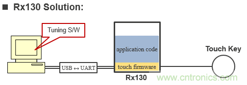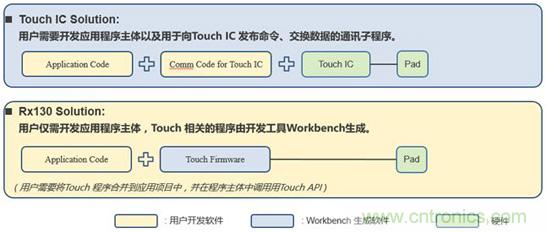 從程序燒寫的成本,比較二者的不同。如圖4所示,如果用戶不使用觸控 IC的缺省參數(shù),而是使用結(jié)合具體應(yīng)用方案優(yōu)化后的參數(shù),那么需要通過編程器將最新的參數(shù)固化到觸控 IC。特別是批量生產(chǎn)時,增加了燒錄觸控 IC的額外成本。而右圖所示的Rx130方案中,僅需要將應(yīng)用程序燒錄到Rx130中。