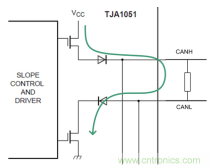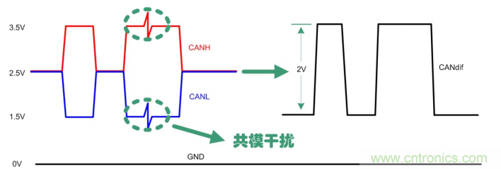 總線固有的差分傳輸形式使得CAN對(duì)于共模干擾有很好的抑制能力,如圖 4所示,通過(guò)CANH、CANL相減可很好地消除來(lái)自外部的共模干擾,但CANH、CANL并非理想對(duì)稱,快速上升的跳變沿,這些均會(huì)帶來(lái)EMC問(wèn)題。我們通過(guò)示波器看總線波形很完美,測(cè)試靜電,EFT,浪涌,傳導(dǎo)騷擾抗擾均無(wú)異常。但測(cè)試傳導(dǎo)發(fā)射,則不能滿足限值要求,看起來(lái)很正常的總線實(shí)際卻向外在發(fā)送傳導(dǎo)干擾。