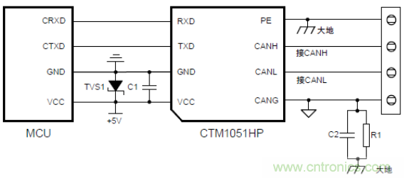ZLG致遠(yuǎn)電子基于多年的總線防護(hù)設(shè)計(jì)積累推出了高防護(hù)等級(jí)隔離模塊——CTM1051(A)HP系列。該系列符合國(guó)際ISO11898-2標(biāo)準(zhǔn),靜電防護(hù)等級(jí)可達(dá)接觸±8kV,空氣放電±15kV,浪涌防護(hù)可達(dá)±4kV隔離CAN解決方案,具體如下圖7所示,能夠適用于各種惡劣的工業(yè)現(xiàn)場(chǎng)環(huán)境。應(yīng)用簡(jiǎn)便,即插即用,應(yīng)用原理圖如下圖8所示。