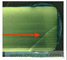 因為MLCC主要成分是陶瓷,在放置元件,分板,上螺絲等工序中,很可能因為機械應(yīng)力過大導(dǎo)致電容受擠壓破裂,從而導(dǎo)致潛在的漏電失效。此時的裂縫一般呈斜線,從端子與陶瓷體的結(jié)合處開裂。