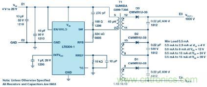 從一個(gè) 4 V 至 28 V 輸入產(chǎn)生 1000 V/15 mA 輸出