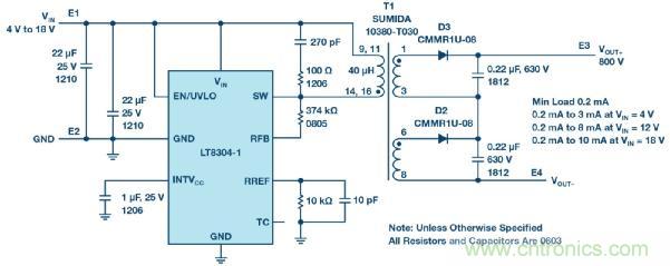 圖 4:一款提供 4 V 至 18 V 輸入的完整 800 V/10 mA 隔離型反激式轉(zhuǎn)換器。