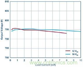 圖 4 顯示一款完整的 4 V~18 V 輸入至 800 V 輸出解決方案,其能夠提供高達(dá) 10 mA 的輸出電流。當(dāng)輸入為 18 V 和負(fù)載電流為 10 mA 時(shí),該反激式轉(zhuǎn)換器可實(shí)現(xiàn) 88.2% 的峰值效率。圖 5 顯示各種不同輸入電壓下的效率曲線;圖 6 顯示了卓越的負(fù)載調(diào)節(jié)性能。另外,該解決方案采用的組件較少。