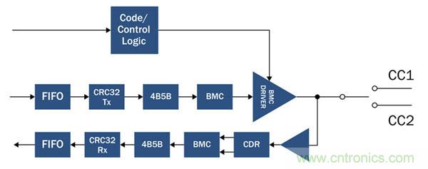 Type-C連接可正反逆插,為用戶帶來了更多的便利,卻使開發(fā)更復(fù)雜。方向通過新的配置通道(CC)管理,該配置通道在連接器上有兩個(gè)專用的引腳,并支持連接的設(shè)備協(xié)商需要提供或汲取多少電源。該通道使用的協(xié)議是一種稱為雙相符號(hào)編碼(BMC)的差分曼徹斯特編碼。USB Implementer Forum(USB-IF)定義了五個(gè)供電配置文件:10W、18W、36W、60W和100 W。使用BMC協(xié)議,電源配置文件可在含USB Type-C接口的兩臺(tái)設(shè)備之間進(jìn)行交換。編碼方案使用轉(zhuǎn)換來表示邏輯電平,而不是絕對(duì)電平,并且它結(jié)合了自己的時(shí)鐘信號(hào),使得同步更簡單。然而,BMC協(xié)議依賴于一個(gè)物理接口,該接口能在具電氣挑戰(zhàn)的環(huán)境中可靠地解碼信號(hào),而且很少有電氣環(huán)境比車輛環(huán)境更具挑戰(zhàn)性。