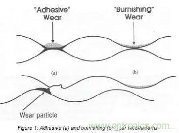 在(b)處較弱的界面可能在原始界面處或附近斷裂,很少發(fā)生磨損。(a)處的磨損過(guò)程通常稱(chēng)為粘著磨損,(b)處的磨損過(guò)程稱(chēng)為拋光磨損。如果在放大鏡下觀察連接器咬合過(guò)程中產(chǎn)生的磨損軌跡,在30~50倍放大時(shí),粘著磨損軌跡將顯示出磨損顆粒的跡象,并顯得有些粗糙,而拋光磨損軌跡將顯得光滑和光亮。