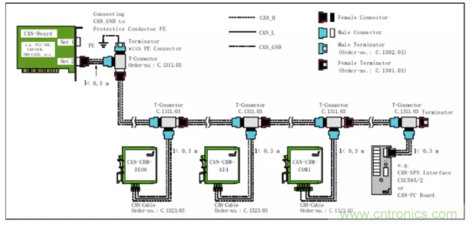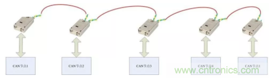 采用CANBridge中繼器,CANHub集線器等組網(wǎng)設(shè)備進行分支。這些設(shè)備每路都具備獨立的CAN控制器,所以可以將每段形成獨立的直線拓撲,方便施工。