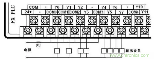 PLC與輸出設(shè)備連接時(shí),不同組(不同公共端)的輸出點(diǎn),其對(duì)應(yīng)輸出設(shè)備(負(fù)載)的電壓類(lèi)型、等級(jí)可以不同,但同組(相同公共端)的輸出點(diǎn),其電壓類(lèi)型和等級(jí)應(yīng)該相同。要根據(jù)輸出設(shè)備電壓的類(lèi)型和等級(jí)來(lái)決定是否分組連接。如圖6所示以FX2N為例說(shuō)明PLC與輸出設(shè)備的連接方法。圖中接法是輸出設(shè)備具有相同電源的情況,所以各組的公共端連在一起,否則要分組連接。圖中只畫(huà)出Y0-Y7輸出點(diǎn)與輸出設(shè)備的連接,其它輸出點(diǎn)的連接方法相似。