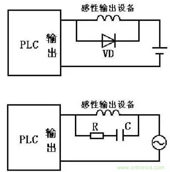 PLC的輸出端經(jīng)常連接的是感性輸出設(shè)備(感性負(fù)載),為了抑制感性電路斷開(kāi)時(shí)產(chǎn)生的電壓使PLC內(nèi)部輸出元件造成損壞。因此當(dāng)PLC與感性輸出設(shè)備連接時(shí),如果是直流感性負(fù)載,應(yīng)在其兩端并聯(lián)續(xù)流二極管;如果是交流感性負(fù)載,應(yīng)在其兩端并聯(lián)阻容吸收電路。如圖6-10所示。
