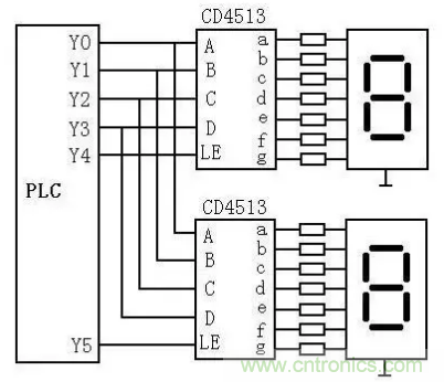如果PLC使用繼電器輸出模塊,應(yīng)在與CD4513相連的PLC各輸出端接一下拉電阻,以避免在輸出繼電器的觸點(diǎn)斷開(kāi)時(shí)CD4513的輸入端懸空。PLC輸出繼電器的狀態(tài)變化時(shí),其觸點(diǎn)可能抖動(dòng),因此應(yīng)先送數(shù)據(jù)輸出信號(hào),待該信號(hào)穩(wěn)定后,再用LE信號(hào)的上升沿將數(shù)據(jù)鎖存進(jìn)CD4513。