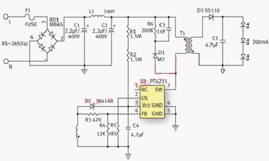下圖是采用PT4215的3W LED燈杯的典型應(yīng)用電路。驅(qū)動(dòng)電路采用反激架構(gòu),工作在DCM模式。采用無光藕設(shè)計(jì),方案簡潔可靠,成本低廉。驅(qū)動(dòng)電路能夠接受85VAC~265VAC輸入范圍,輸出電流300mA,驅(qū)動(dòng)3顆1W LED串聯(lián)的燈串。