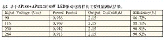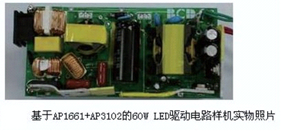 AP1661是一款工作于臨界導(dǎo)通模式下的有源功率因數(shù)校正控制芯片,可廣泛應(yīng)用于開關(guān)電源、LED驅(qū)動(dòng)和電子鎮(zhèn)流器的預(yù)調(diào)整變換器控制。該芯 片內(nèi)部包括1個(gè)啟動(dòng)定時(shí)器可滿足待機(jī)應(yīng)用要求,1個(gè)能實(shí)現(xiàn)接近于1的功率因數(shù)的單象限乘法器和1個(gè)零電流檢測模塊確保臨界斷續(xù)方式工作。AP1661的圖 騰柱驅(qū)動(dòng)輸出能夠?yàn)橥獠縈OSFET或IGBT提供最大600mA驅(qū)動(dòng)電流和800mA關(guān)斷電流能力。采用了先進(jìn)的雙極型互補(bǔ)金屬氧化物半導(dǎo)體設(shè)計(jì)和制造 工藝,具有低啟動(dòng)電流,低工作電流和低功耗的特點(diǎn)。AP1661同時(shí)具有完善的保護(hù)功能,包括過壓保護(hù)、帶有滯后的輸入欠壓鎖定和乘法器輸出嵌位以限制開 關(guān)最大峰值電流。圖7為該方案60W應(yīng)用電路樣機(jī)實(shí)物照片。圖8為應(yīng)用該方案LED直管燈實(shí)物照片。