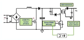 在更大功率應(yīng)用條件下,單級PFC電路難以同時(shí)兼顧PFC預(yù)調(diào)整和反激電路輸出恒流調(diào)整性能,這時(shí)需要采用兩級電路架構(gòu)實(shí)現(xiàn)這一目標(biāo)。因此,有新推出的PFC+PWM 兩級架構(gòu)電路拓?fù)浞桨?,該方案電路原理圖如圖9所示。