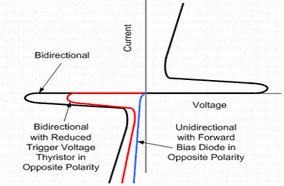 大多數(shù)晶閘管浪涌保護(hù)器件(TSPD)是對稱的雙向特性的,但也有內(nèi)含二極管單向特性的,如圖7所示。而不對稱的雙向晶閘管浪涌保護(hù)器件(TSPD)是在一個極性方向有著減小了的觸發(fā)電壓,如圖7所示。