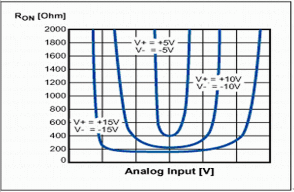 圖4. 早期故障保護(hù)開關(guān)的導(dǎo)通電阻隨信號(hào)電壓的變化