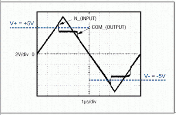 如圖5所示,這些開關(guān)由一個(gè)n溝道FET (N1)和一個(gè)p溝道FET (P1)并聯(lián)構(gòu)成低阻抗輸入到輸出信號(hào)通道。只要輸入信號(hào)位于電源范圍以內(nèi),或不超出電源150mV,就可通過開關(guān)到達(dá)COM端,因此允許開關(guān)滿擺幅工作。