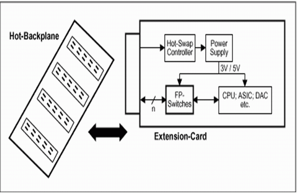 除了一些典型應(yīng)用以外,例如在ATE和工業(yè)設(shè)備中作為模擬輸入的保護(hù),這些低電壓、故障保護(hù)型開關(guān)還可以在很多其他應(yīng)用中用來(lái)簡(jiǎn)化設(shè)計(jì)和解決板上空間不足的問題。舉例來(lái)講,為了避免切斷整個(gè)設(shè)備機(jī)箱的電源,許多應(yīng)用要求能夠向一個(gè)帶電的底板插入擴(kuò)展卡。盡管可以用MAX4271這樣的熱插拔控制器來(lái)限制卡上的浪涌電流,但其信號(hào)線的保護(hù)并不容易。當(dāng)你將板卡插入底板時(shí),底板的數(shù)據(jù)總線采用5V TTL電平進(jìn)行通信,這時(shí)卡上的數(shù)字IC (微控制器,ASIC等)就有可能在5V電源接通前在其輸入端“看到”5V電壓。前面已經(jīng)提到,這種情況會(huì)導(dǎo)致鎖定或板卡損壞。