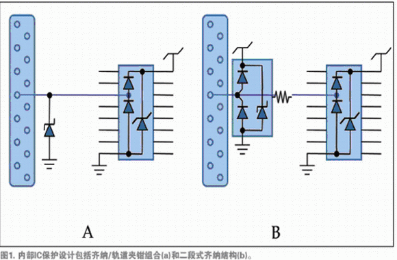 例如,與信號輸入相關(guān)的IC焊墊的特點是齊納二極管和結(jié)型鉗位二極管連接供電軌(圖1a),或者兩段式齊納鉗位二級管連接地面(圖1b)。多供電軌的IC需要使用軌道夾鉗阻止軌道在高速電流瞬變時擴散。