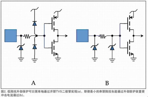 設(shè)計時,可以保護簡單低速的單端輸入/輸出(I/O)線,開發(fā)利用類似于IC制造商使用的拓?fù)浣Y(jié)構(gòu)。實際上,如果選擇了更有效的抑制器,并且將其放置在離瞬態(tài)切入點盡可能近的位置,產(chǎn)品的瞬態(tài)承受能力將會大大地提高。如果輸入/輸出線需要低阻抗回路,可以簡單地使單一的TVS二極管鄰近信號的外部連接器(圖2a)。這個處理方法會使外部和芯片上的二極管共享電流。
