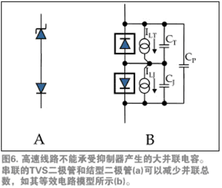 例如,如果某元件僅需要單向運行,抑制器制造商可以通過一系列TVS二極管和結(jié)型二極管形成低電容抑制器(圖6a)。在斷開狀態(tài)下,這種結(jié)構(gòu)的純電容等于