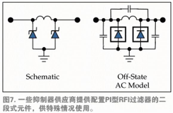 類似圖1b中的片上二段夾鉗結(jié)構(gòu)也應(yīng)用于外部夾鉗,在相同設(shè)備中同時實現(xiàn)瞬態(tài)超電壓防護和電磁干擾(EMI)過濾。這種布局是基本的π形網(wǎng)絡(luò),同時,TVS二極管的寄生電容有利于完成EMI過濾。電阻和感應(yīng)網(wǎng)絡(luò)均可直接利用,滿足各種實體電路層對于信令的具體要求(圖7)。抑制器供應(yīng)商通常按照通信標(biāo)準(zhǔn)在選擇器向?qū)е袑υ右詤^(qū)分,確保適當(dāng)?shù)膸捄湍承┨匦宰杩沟膽?yīng)用。
