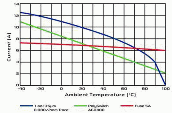 必須注意的是,在整個溫度范圍內(nèi),PPTC器件的觸發(fā)電流是如何跟隨印制線上的電流。在這兩種情況中,即使可以使用熔斷器,在汽車高于有用的標準溫度下,尺寸最接近的熔斷器也不能保護它。