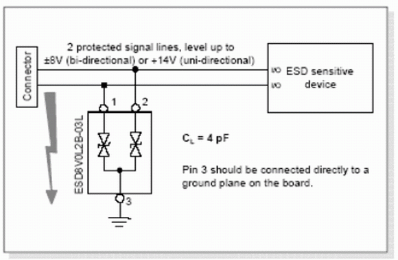 如圖4所示,USB2.0傳輸鏈路的差分?jǐn)?shù)據(jù)線應(yīng)連接至ESD8V0L2B-03L的管腳1和管腳2上。二極管的管腳3接地。由每個二極管產(chǎn)生的線路電容都是4pF,差分線間的電容為2pF。