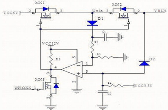即當(dāng)VBUS大于3.3(R2+R3)/ R2 + UD1時(shí),比較器便會(huì)將MOS管關(guān)斷。