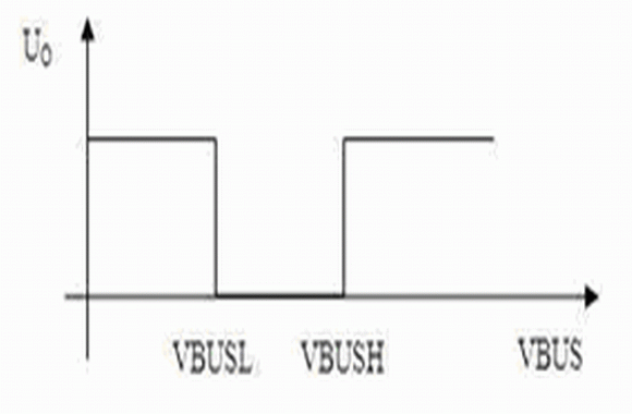 當(dāng)U- > U+ 時(shí),比較器輸出電平發(fā)生反轉(zhuǎn),由式(1)、(4)、(7)、(8),設(shè)此時(shí)VBUS的值為VBUSL,有: