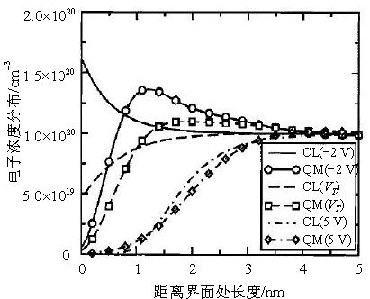圖1給出了不同的柵壓下考慮多晶硅量子效應時多晶硅中載流子的分布和經(jīng)典下載流子的分布,圖中CL為經(jīng)典描述下載流子分布,QM為考慮量子效應下載流子的分布。體原封不動摻雜為1018 cm−3,多晶硅摻雜為1020 cm−3。當所加電壓為負電壓和柵壓為閾值電壓時,量子效應下的載流子分布與經(jīng)典的情況有很大的差別,而加的正電壓很大時,量子情況與經(jīng)典情況沒有很明顯的差別。這是由于在外加電壓為負時,能帶的突然變化對電子波函數(shù)有顯著影響;而外加電壓為正的時候,對電子波函數(shù)影響很小。