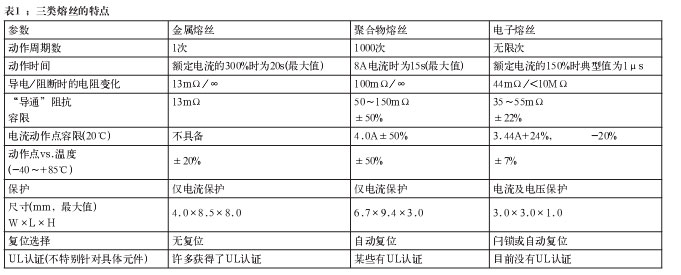 聚合物器件以導(dǎo)電型塑料制成,這些器件在電流(內(nèi)部熱量)達(dá)到預(yù)設(shè)定的電平時(shí)會(huì)改變它們的阻抗。這些器件也經(jīng)常與TVS器件一起使用,就像金屬熔絲那樣。電子熔絲是半導(dǎo)體電路,控制功率開關(guān)(通常是功率MOSFET),并按照預(yù)設(shè)的參數(shù)改變其阻抗。表1簡單比較了這三類熔絲。