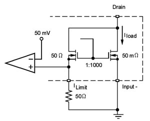 電子熔絲使用SENSEFETTM來開關(guān)電源、限制電流及監(jiān)測輸出電流。SENSEFET的優(yōu)勢是僅測量小部分的負(fù)載電流。沒有SENSEFET,全部負(fù)載電流將要流經(jīng)感測電阻,而這將需要大功率、極低阻抗的電阻。與價(jià)格不足1美分的小型片式電阻相比,這些電阻較昂貴。