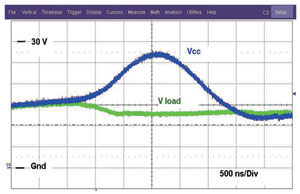 圖2展示NIS5132的一對(duì)曲線。導(dǎo)通較低的曲線時(shí),激活的是短路曲線。一旦電流降低至低于這個(gè)電平,F(xiàn)ET就完全導(dǎo)通(線性區(qū)域),接下來面對(duì)的就是過載電平。如果電流達(dá)到過載電平,F(xiàn)ET的柵驅(qū)動(dòng)將立即減小,而漏極至源極電壓將增加,并會(huì)將工作模式改為短路電平模式。這器件在過載電平時(shí)不能維持穩(wěn)態(tài)工作。