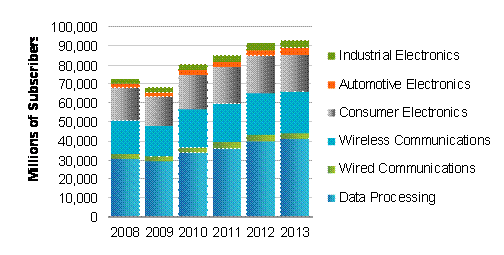 據(jù)iSuppli 公司研究,2009 年中國(guó)半導(dǎo)體市場(chǎng)為682億美元,較去年下滑6.8%。相對(duì)于全球半導(dǎo)體市場(chǎng)的萎縮,中國(guó)市場(chǎng)的下滑要小的多。受經(jīng)濟(jì)危機(jī)影響,全球電子產(chǎn)品的產(chǎn)值為1.4萬(wàn)億美元較2008年下降了9%。與此同時(shí),全球半導(dǎo)體市場(chǎng)2009年將下降16.2%到2295億美元。但是在出口增長(zhǎng)和內(nèi)需拉到的雙重作用下,中國(guó)半導(dǎo)體市場(chǎng)在2010年成長(zhǎng)17.8%。 全球半導(dǎo)體市場(chǎng)2010年也將增長(zhǎng)13.7% 到2610億美元。