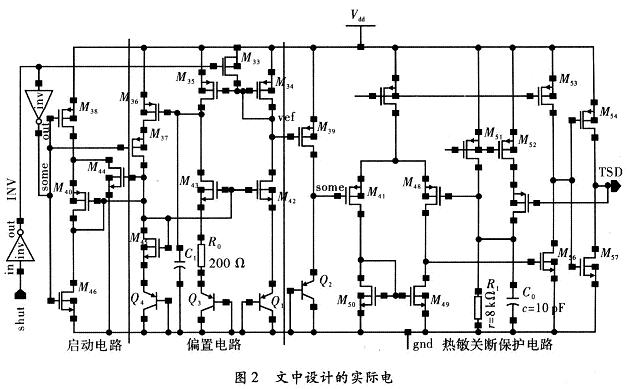 整個工作過程中,TSD的正反饋起到了遲滯的作用。使得正常工作時,TSD輸出高電平作用于電路其它模塊。當(dāng)溫度過高時,TSD輸出低電平作用于電路其它模塊,使芯片停止工作,保護(hù)芯片。