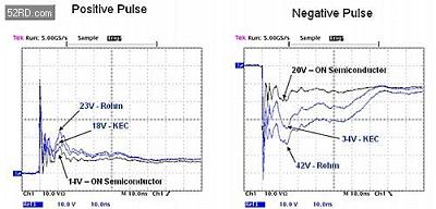 從圖3所示的圖上可見,顯然,與兩個(gè)競爭對手的器件(藍(lán)色波形)相比較,安森美半導(dǎo)體保護(hù)解決方案(黑色波形)可提供更低的ESD脈沖箝位電壓。與KEC的18V和Rohm的23V相比較,安森美的器件將正脈沖箝位在14V。而在負(fù)脈沖期間,這三個(gè)器件之間箝位電壓的差異更加明顯。安森美、競爭對手2和競爭對手1的器件對負(fù)脈沖的箝位電壓分別是20V、34V和42V。