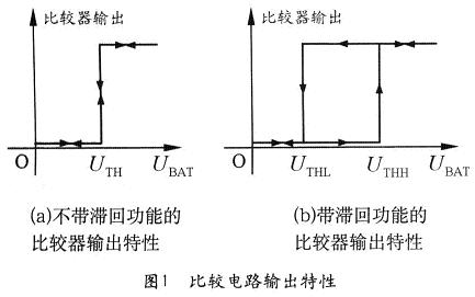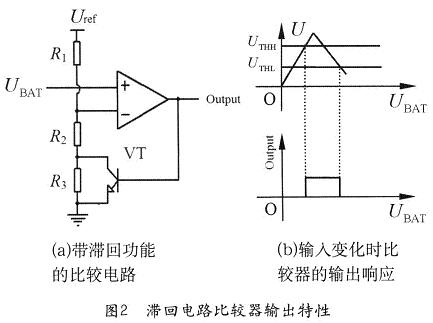 但如果在比較電路中設(shè)置兩個(gè)門限電壓:UTHH和UTHL(UTHH>UTHL),則可以形成一個(gè)滯回區(qū),如圖1(b)所示。當(dāng)電池電壓從低升高至UTHH時(shí),比較器輸出高電平,打開電子開關(guān),給負(fù)載供電;當(dāng)電池電壓降低至UTHL時(shí),比較器輸出低電平,斷開負(fù)載。這個(gè)時(shí)候電池端電壓雖然會(huì)迅速升高至UTHL以上,但由于達(dá)不到UTHH,所以,比較器仍然輸出低電平,負(fù)載仍被斷開,直到電池被充電后電壓升高至UTHH以上才能再次接通負(fù)載。這樣就避免了電路的振蕩,保護(hù)了負(fù)載和電池。