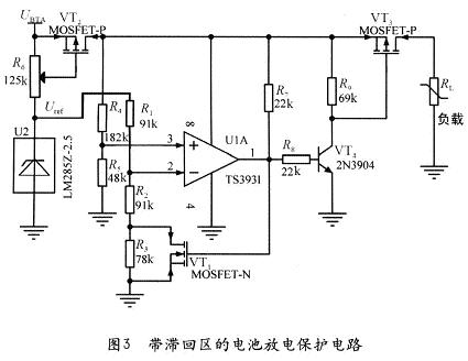 圖3是具體的硬件電路圖,參考電壓由LM285Z一2.5分流穩(wěn)壓器產(chǎn)生,它最低只需要10μA的通過電流就可輸出穩(wěn)定的2.5V參考電壓,這可大大降低電池在低壓閉鎖狀態(tài)的功耗。比較器選用了ST公司TS393I,它是一種微功耗比較器,這樣,所有分壓電阻的阻值可以選的很大,進(jìn)一步降低了功耗。比較器的輸出控制P溝道的MOSFET、VT3接通或斷開負(fù)載。當(dāng)電池電壓降低到一定程度時(shí)VT2關(guān)斷,使得由比較器組成的保護(hù)電路與電池?cái)嚅_,極大地減小的電池的能量消耗,電池處于一種近似自然放電的狀態(tài);當(dāng)電池電壓恢復(fù)時(shí),VT2自然導(dǎo)通,保護(hù)電路重新恢復(fù)工作。