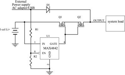 另外,MAX4842的過壓保護門限為4.4V-5.0V,也高于單節(jié)鋰電的4.2V上限電壓。電源切換電路是利用MAX4842的使能控制引腳/EN配合分壓電阻R1/R2實現(xiàn)的。當沒有外部電源接入時,如果電池電壓高于2.8V-3.2V的保護門限,/EN被R2拉低,MAX4842驅(qū)動Q1、Q2的柵極為高電平使其導通,電池為負載供電;當有外部電源接入時,通過R1/R2分壓后在/EN引腳上產(chǎn)生的電壓高于1.47V后MAX4842被禁止,Q1、Q2被關(guān)閉,由外部電源給負載供電。圖中的二極管D2用于阻斷灌入外部電源的反向電流,并防止/EN被錯誤拉高。由于它串在外部供電通路上,損失一點效率沒有關(guān)系。