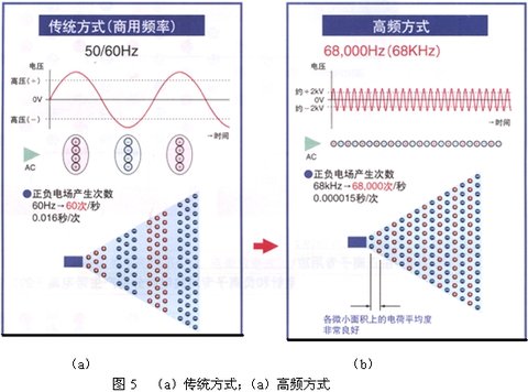 ⑴ 除靜電器有軟X線式、電暈放電式、放射線式與紫外線式等4種。而電暈放電式又分DC方式與AC方式2種。而DC方式含有脈沖DC式;AC方式又分為商用AC,高頻AC及脈沖AC等3種。下邊介紹電暈放電式和離子的產(chǎn)生。