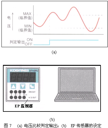 ⑷ 判定輸出功能。一旦超過設(shè)定電壓(臨界值),便會通過傳感器LED和電壓比較輸出(判定輸出)發(fā)出通知,如圖7(a)所示。