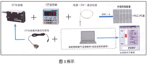 從圖8可知,通過電腦進(jìn)行設(shè)定的EP監(jiān)視器連接是由外部控制裝置與電腦及其組件構(gòu)成。而組件必需是EP傳感器1臺(如DTY-EPS型)與EP監(jiān)視器1臺(如DTY-EPU)及電源SW•通信電纜線.及EP傳感器用通信電纜線。