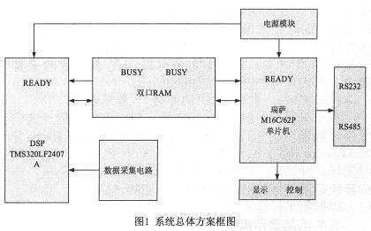 硬件平臺是軟件算法的運行載體,是實現(xiàn)準確、高效選線的保障。本文設(shè)計的選線裝置采用雙CPU。即"DSP+單片機"的處理機構(gòu)。DSP作為運算CPU,負責信號采集、選線計算部分;單片機作為管理CPU,主要負責人機交互部分。DSP處理器由于內(nèi)部采用哈佛總線結(jié)構(gòu),指令是流水線操作,以及獨立的硬件乘法器結(jié)構(gòu)等,非常適合進行數(shù)字信號處理,進行實時的數(shù)據(jù)分析和監(jiān)控。本文采用TI公司的TMS320LF2407A(以下簡稱LF2407A)DSP芯片為數(shù)據(jù)采集和處理CPU,充分利用其強大的數(shù)據(jù)處理能力和速度,實現(xiàn)多點數(shù)據(jù)采集和快速參數(shù)計算。單片機采用瑞薩M16C/62P系列單片機,該單片機具有很強的抗干擾能力和1M的尋址空間,適用于事件管理和人機交互。系統(tǒng)總體方案如圖1所示。本保護裝置位于現(xiàn)場,進行數(shù)據(jù)采集和處理,并且與上位機之間進行通信。保護裝置采用M16C/62P單片機為主CPU,負責系統(tǒng)顯示、控制和與上位機通信;采用TMS320LF2407ADSP為從CPU,負責數(shù)據(jù)采集和處理;DSP與單片機之間用雙端口RAM進行通信。系統(tǒng)通過RS232和RS485與上位機通信。