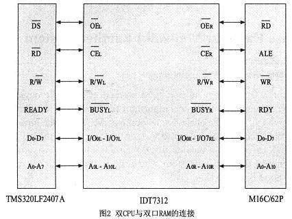 由于系統(tǒng)采用雙CPU,為了實現(xiàn)兩個CPU之間大量數(shù)據(jù)的快速交換,本裝置采用雙口RAM來實現(xiàn)兩CPU之間快速的數(shù)據(jù)交換。