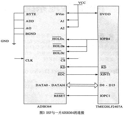 TMS320LF4207A本身雖然自帶A/D轉(zhuǎn)換器,但其轉(zhuǎn)換精度只有10位,且轉(zhuǎn)換速度也不高(500ns)。為了實現(xiàn)更高的速度和精度,選擇了擴展ADS8364芯片。ADS8364是一種高速、低功耗、雙16bA/D轉(zhuǎn)換器,有6個模擬量輸入通道??捎肂VDD獨立供電。它有6個完全相同的采樣保持電路,分成A、B、C3組,每一組都由1個HOLD引腳控制。ADS8364可以從外部引入最大5MHz的時鐘頻率,此時采樣時間是0.8μs,轉(zhuǎn)換時間只有3.2μs,A/D的最大采樣率達到250K,要達到此值,可在下一次轉(zhuǎn)換開始時讀取上一次的轉(zhuǎn)換結(jié)果。此A/D完全可以滿足本裝置的采樣要求。AD芯片與DSP的連接如圖3所示。